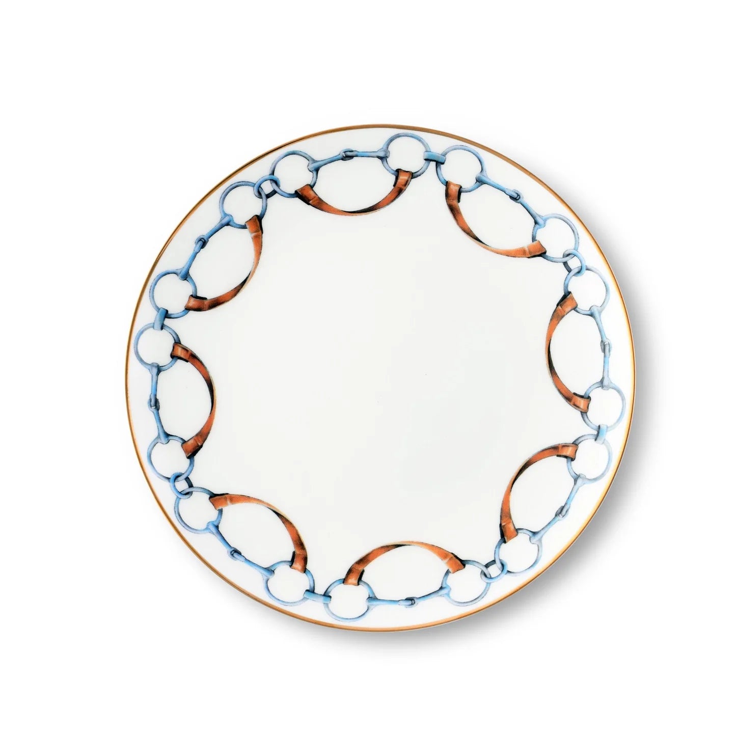 This Bit Pattern Bone China is a sleek twist on the iconic equestrian snaffle bit theme, taking it a step further into a striking Bone China dinnerware collection of polished sophistication. Whether tail-gaiting or setting an elegant table for a formal dinner party, these pieces present a statement of classic high style and are sure to garner attention and admiration. Fine Bone China was designed and hand-drawn by master artist Leesa Greenlee. Shiny Gold rimmed add a formal class and style.