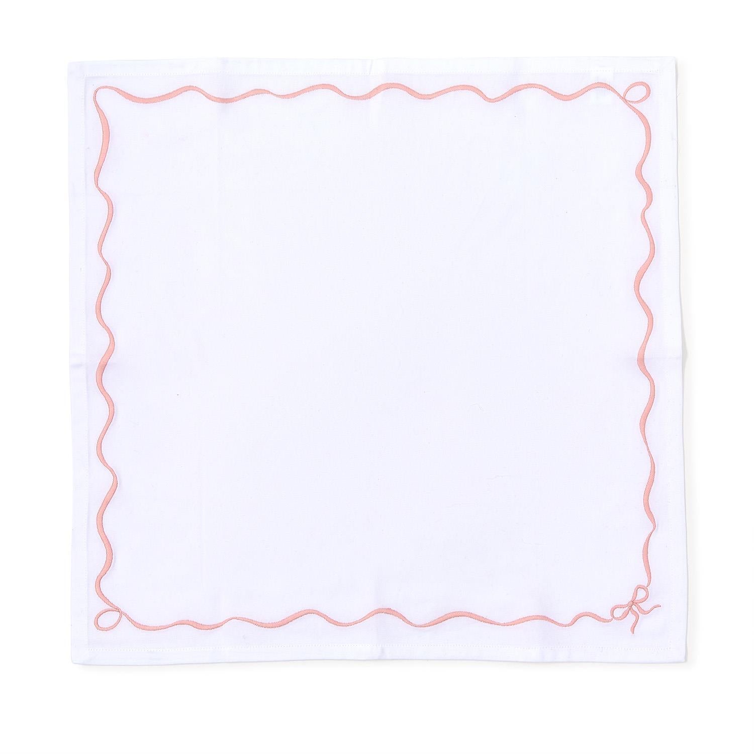 This set of four embroidered dinner napkins features a delicate pink bow design, adding a playful yet refined touch to any table setting. Made from soft cotton, these napkins are perfect for any casual or special occasion. Their embroidered details make them a charming and functional addition to your tableware.