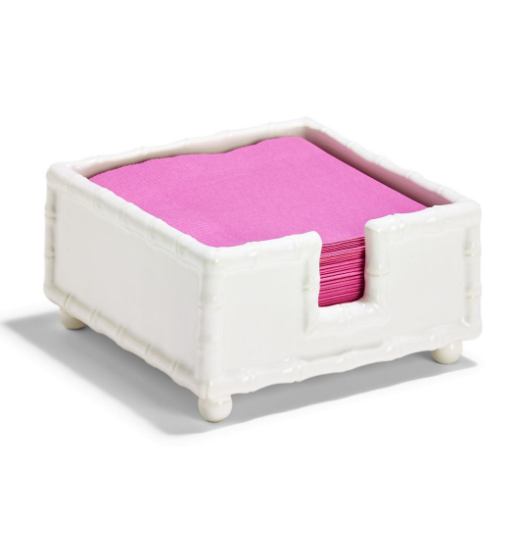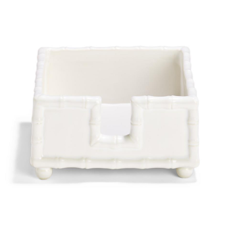 Keep napkins neat and orderly with this glazed ceramic Cocktail Napkin Holder. The Ceramic has been molded into the shape of Bamboo around the edges and features 4 round feet so it stands raised above your countertop.