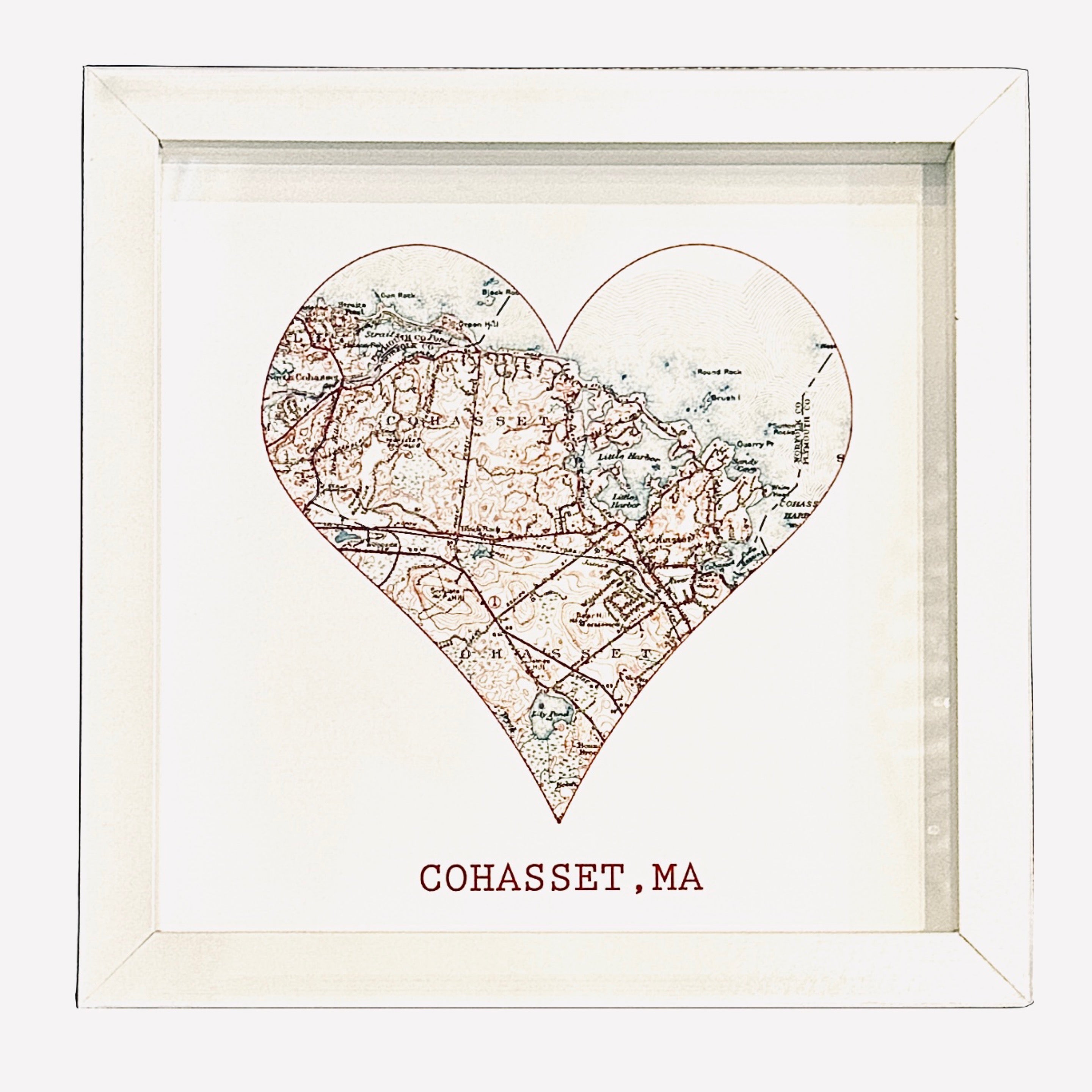 Created by a local artist, this "Cohasset" heart shaped map is the perfect gift! Ideal as a hostess or graduation gift, and for anyone leaving or moving into the neighborhood.