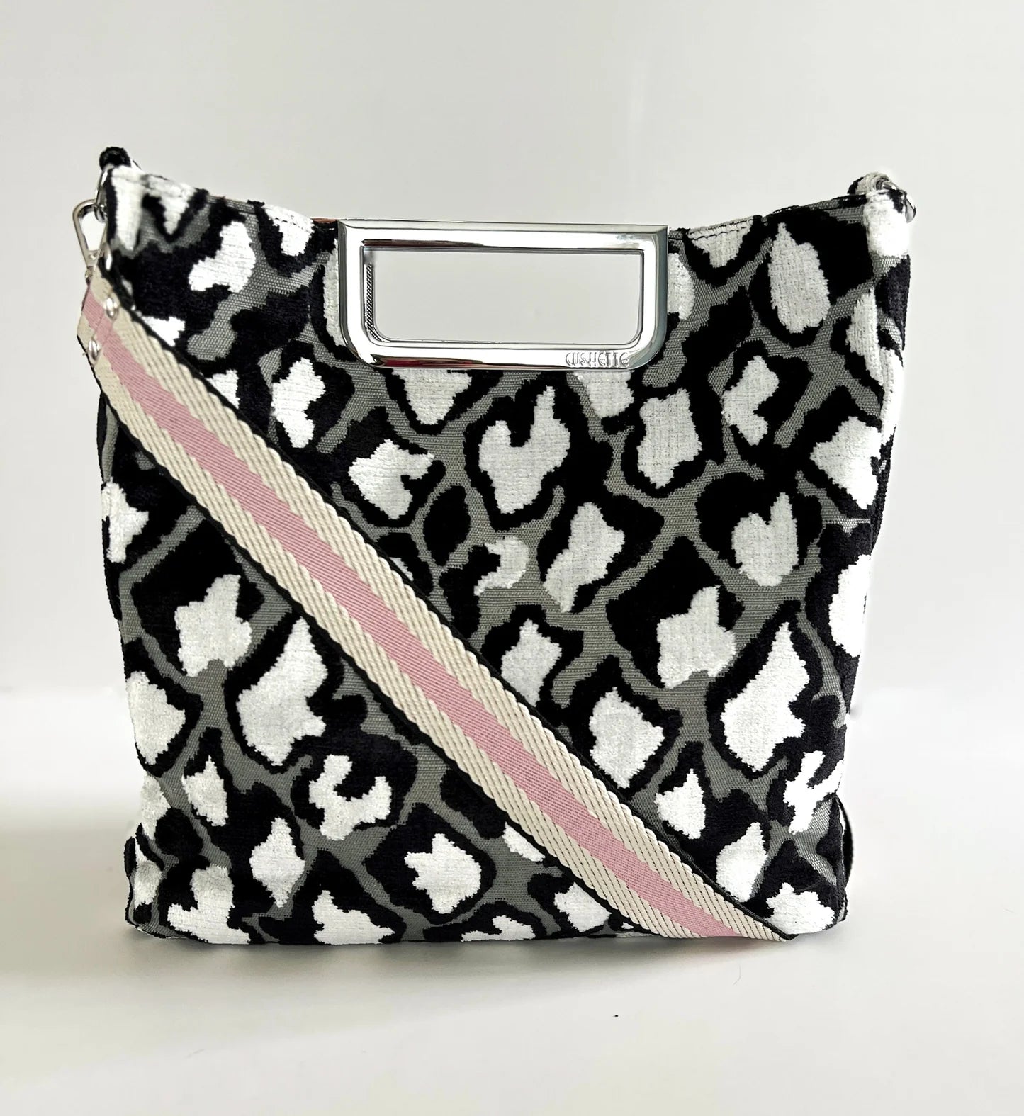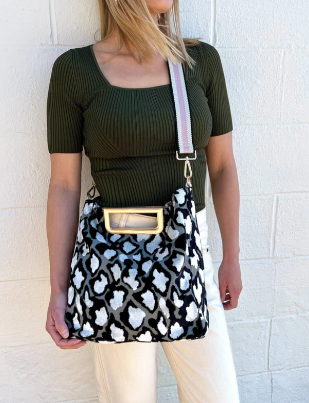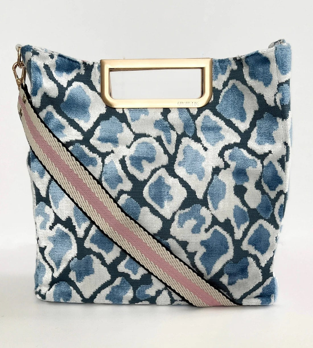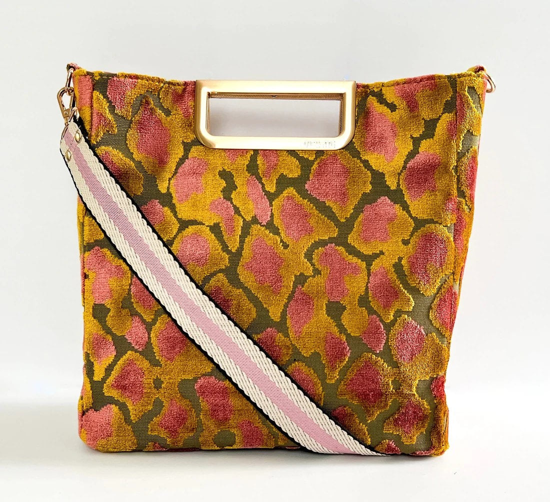 - Luxurious printed velvet fabric with chic brushed handle and hardware