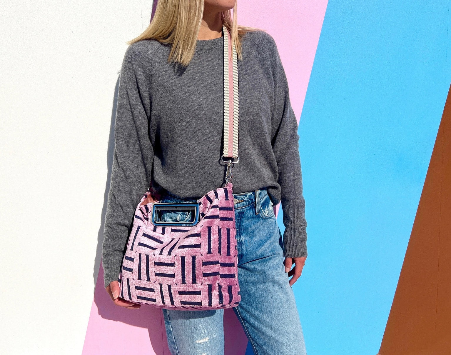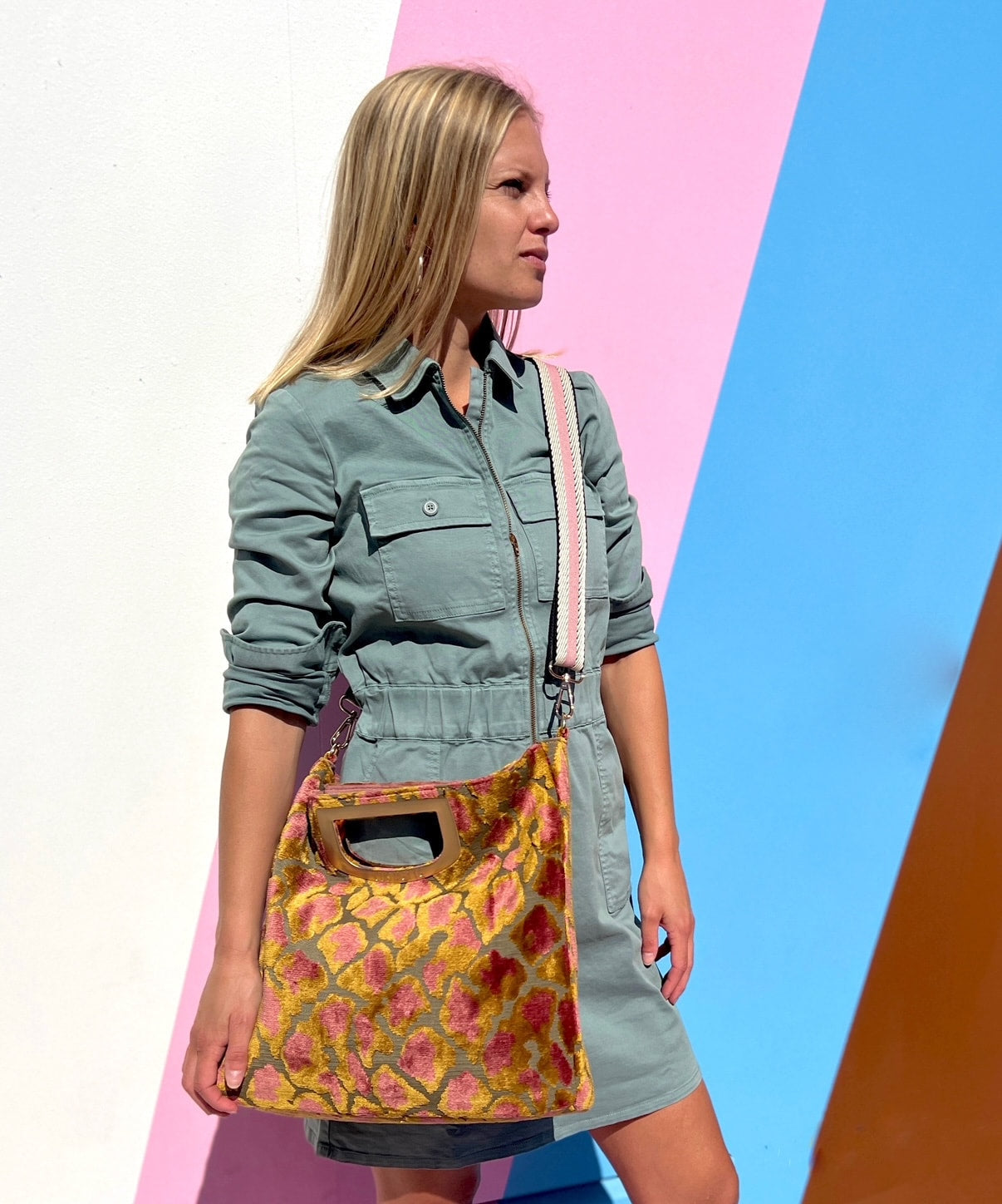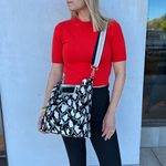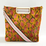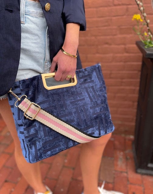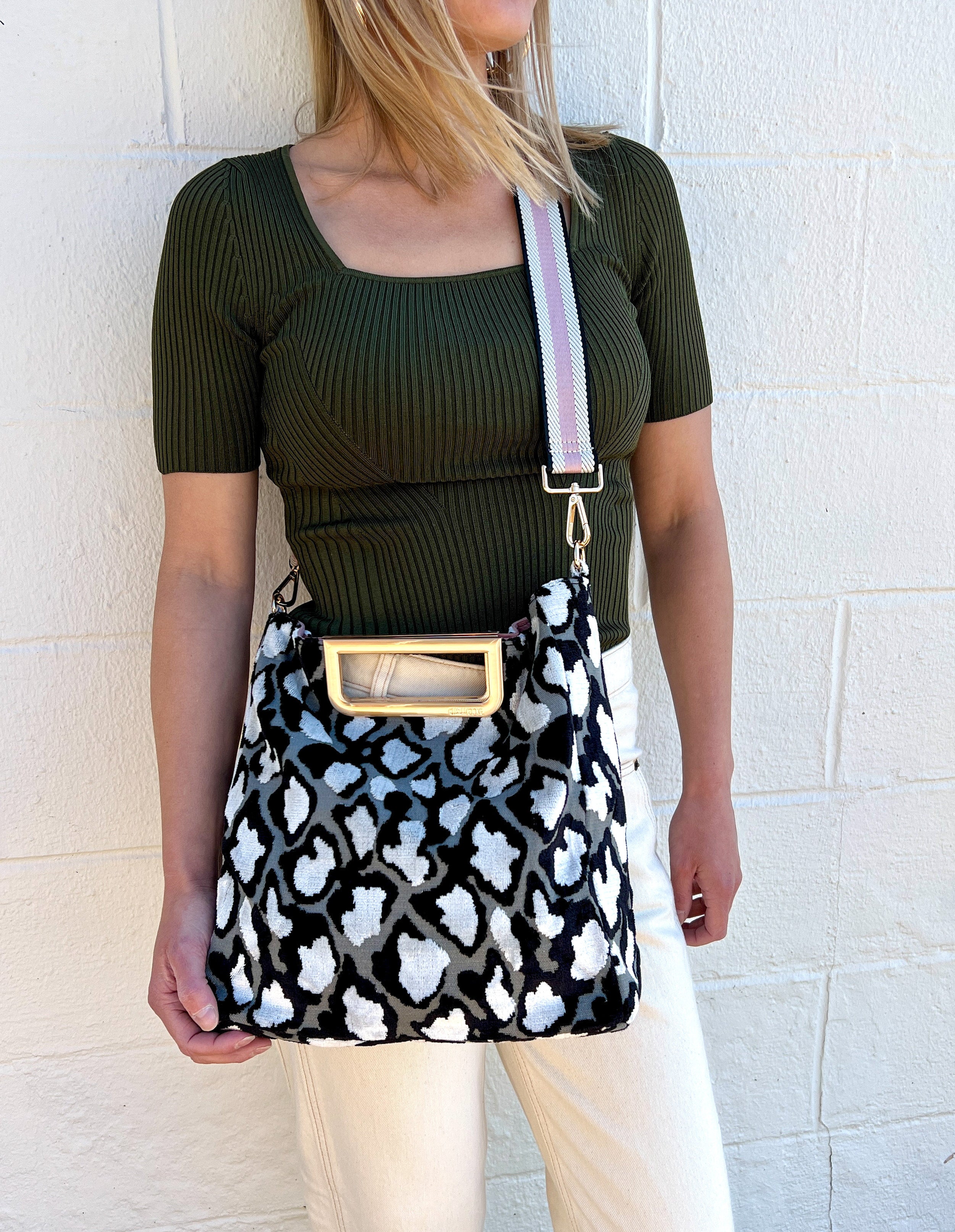 - Luxurious printed velvet fabric with chic brushed handle and hardware