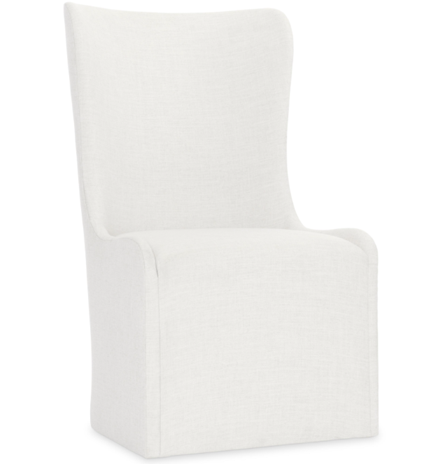 A sinuous style and sleek lines craft this dining chair with the look of a slipcovered design. The fully upholstered chair has a gently curving wingback shape that's been refashioned into a very modern form. Hidden casters allow the chair to move gracefully to and from the table.