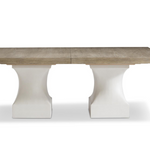 Sleek sculptural forms elevate the simple lines of this dining table. The table pedestals are formed with concave cast resin over a square base in the Tusk finish. The wood top, which includes two 20-inch leaves, offers a stunning contrast in the warm Marcona finish. Includes dining table top and base.
