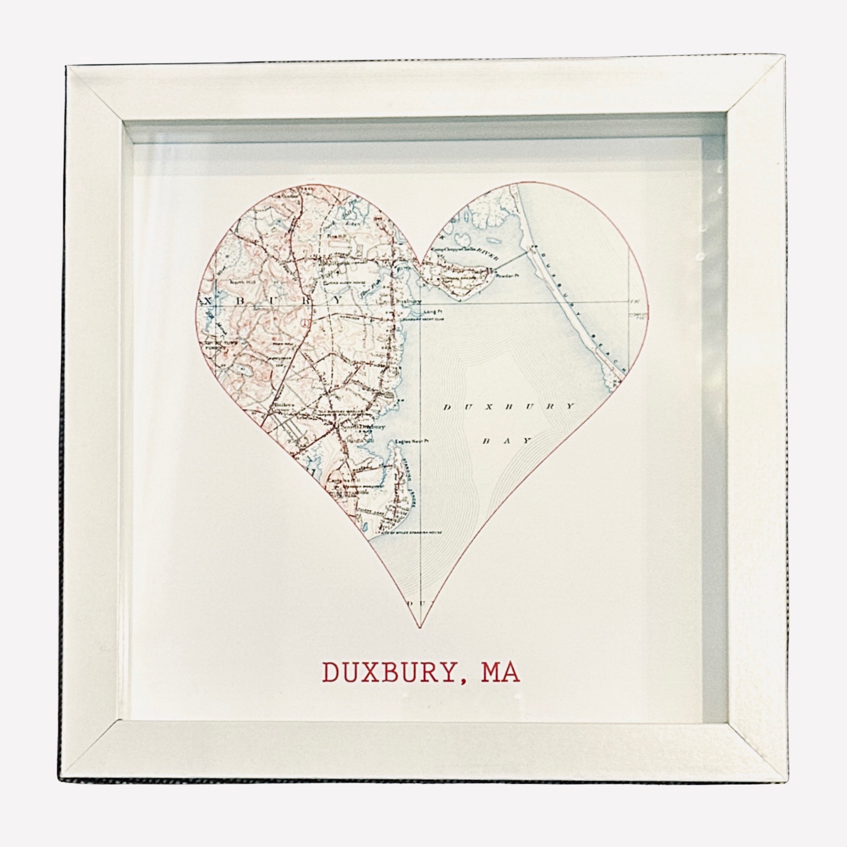Created by a local artist, this "Duxbury" heart shaped map is the perfect gift! Ideal as a hostess or graduation gift, and for anyone leaving or moving into the neighborhood.