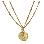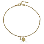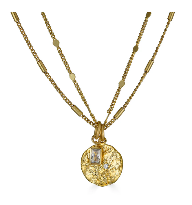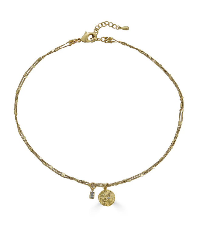 Elevate your style with this elegant gold double-chain necklace, featuring a beautifully textured hammered coin pendant and a delicate rectangular charm. The layered chains are accented with fine details, adding depth and sophistication to this versatile piece.
