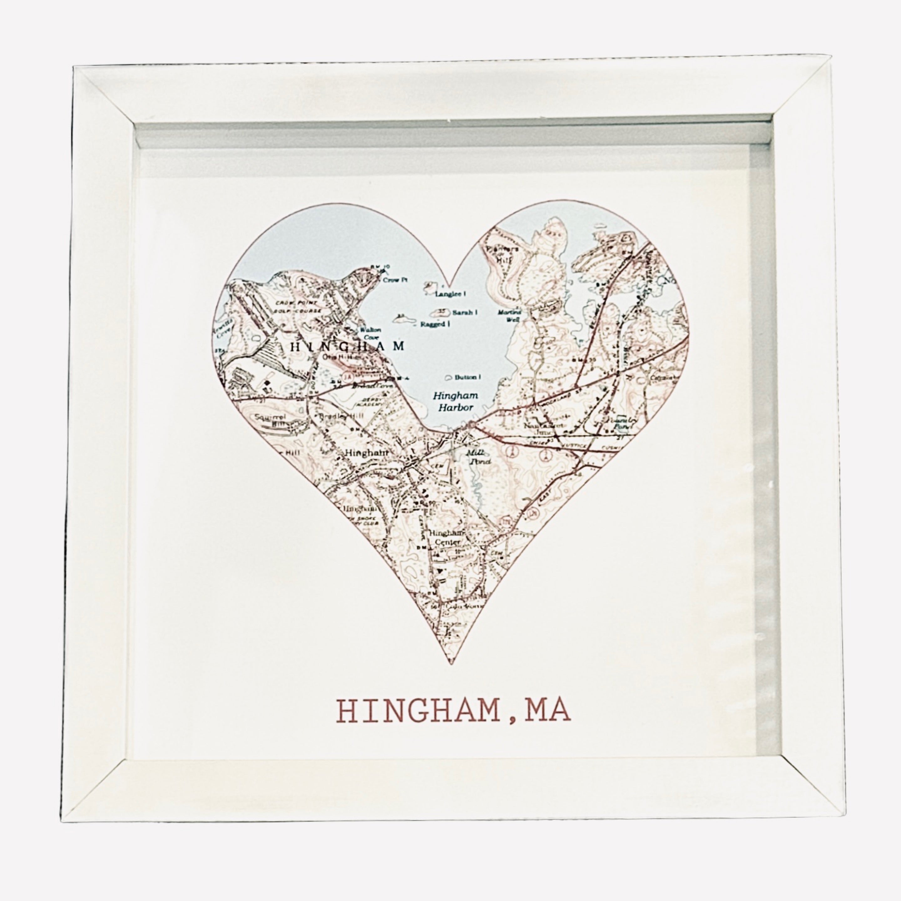 Created by a local artist, this "Hingham" heart shaped map is the perfect gift! Ideal as a hostess or graduation gift, and for anyone leaving or moving into the neighborhood.