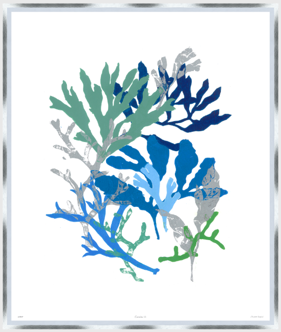Enjoy calm serenity with these blue green coral art pieces. Using a dynamic mix of acrylics, watercolors, and printmaking, the artist creates layered textures that invite viewers to explore her art both visually and tactilely. These art pieces will add a touch of coastal living to any space.