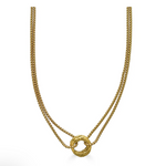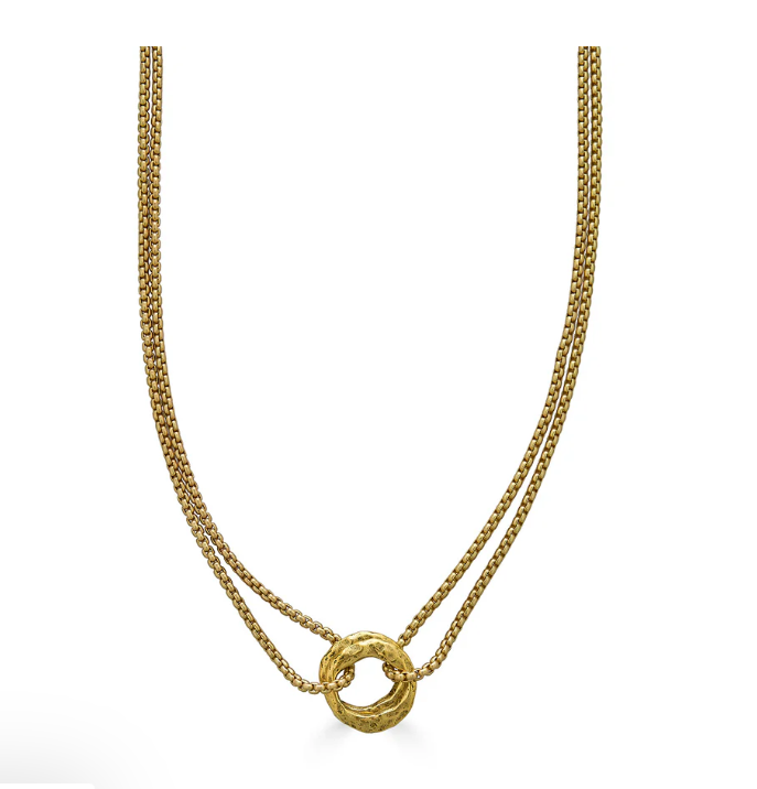 A modern and minimalist necklace defined by its casual elegance, this matte gold chain necklace will elevate any day-to-day look. Featuring two hammered circle pendants and doubled chain for just the right touch of interest and detail.