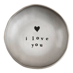 This Round Metal Trinket Dish is the perfect gift to show how much you care. Features a round metal design with the words "I Love You". Place it on the dresser, vanity, or nightstand to keep treasured trinkets, jewelry, and small items items safe. Great gift for any best friend, mother, grandmother, sister or spouse. Great for Valentine's Day, Mother's Day, birthday, holiday or any occasion!