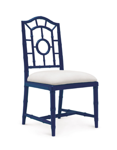 Crafted with ornate elements of Chinoiserie design, made famous by the likes of Thomas Chippendale in the 18th century, and pared them down to showcase their elegant essence through refined simplicity. Solid mahogany has been expertly carved to resemble bamboo, lacquered and finished in rich navy blue, which here makes up the fretwork of this side chair, forming an airy, Asian-inspired patterned back. With a lightness fit for a sunny beach home (or a bedroom, living room or study you wish would feel like one), the faux bamboo continues down through the legs and decorative stretcher, all pulled together by a comfortable linen drop-in cushion seat. As a set in a kitchen or dining room, these chairs provide upscale luxury with a touch of Pacific paradise.
