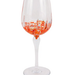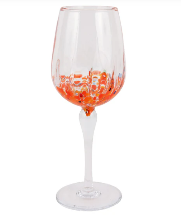 Dynamic streaks of blue adorn this mouthblown orange wine glass. The confident ribbons of color create a unique and lively table, perfect for any occasion.