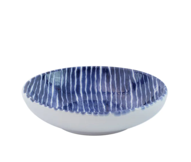 Recreate the beautiful mosaic tiles found in the Greek Isles with the Santorini Stripe Condiment Bowl, painted on hard ceramic in a fun blue and white striped pattern.