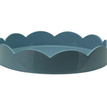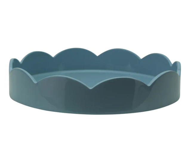 A perfect addition to any space, this tray is perfect to display your decorative accessories, or as part of a tablescape. This pretty pale denim blue round scallop small tray is finished with 20 coats of high gloss lacquer, hand polished between each coat. The base is painted black satin.