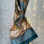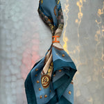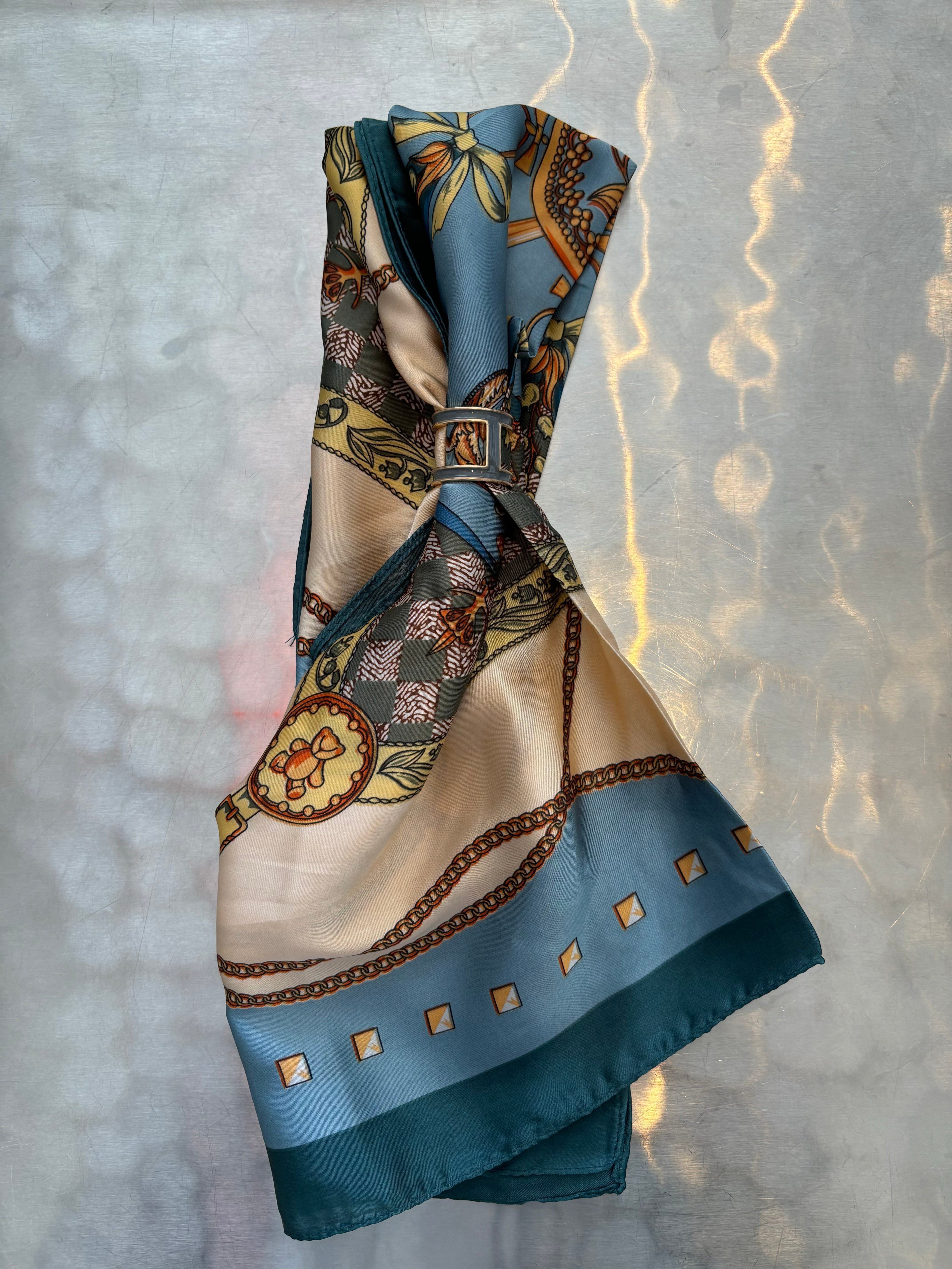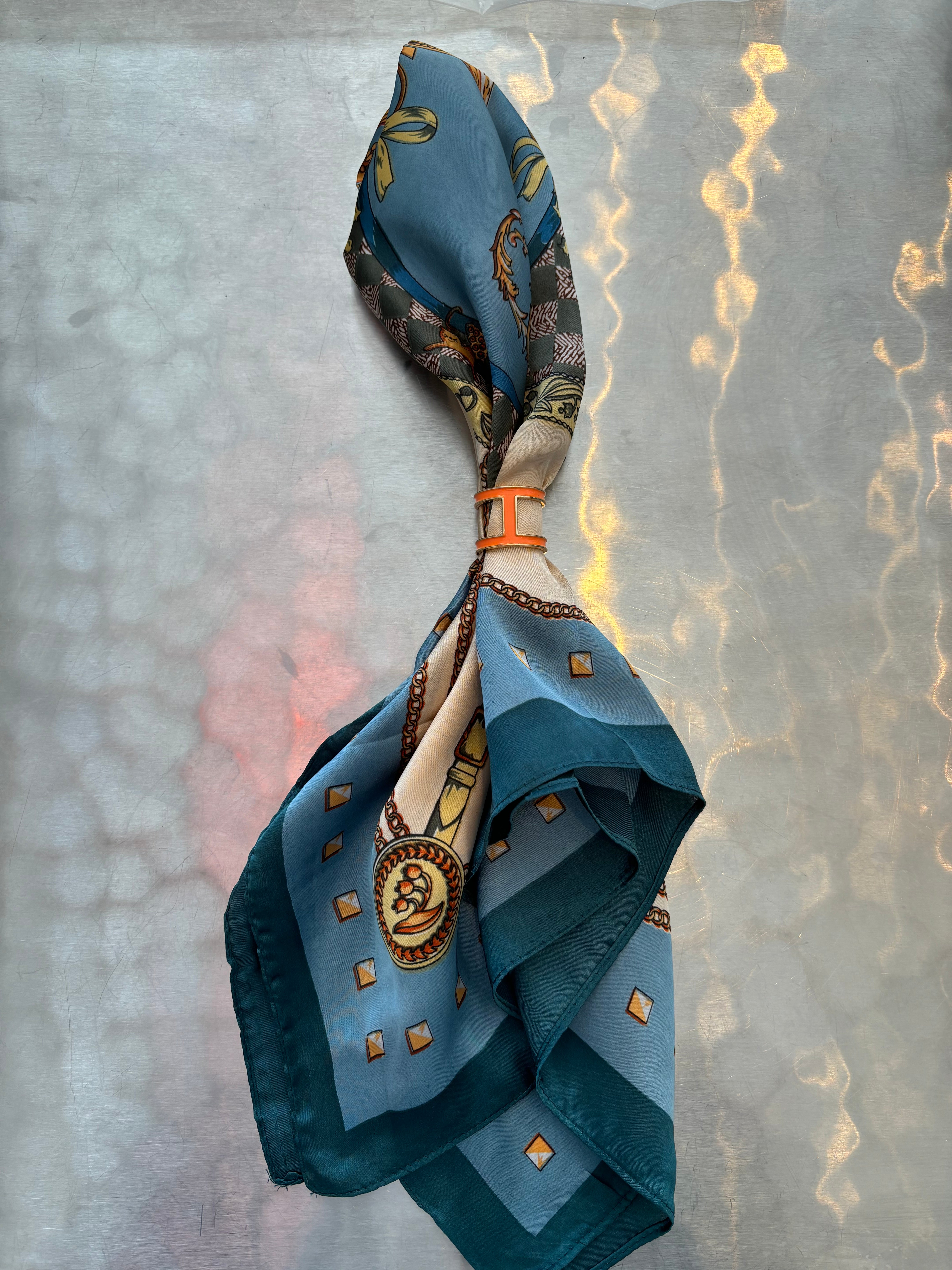 Add style & flair to any outfit with these luxurious silky scarves! Wear them as a headwrap, as a neck scarf, or tie to your favorite handbag. Included is a scarf ring in either orange or bluish gray.
