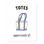 Experience the simplicity and whimsical charm of this "Totes Appreciate It" Greeting Card. This 5.5”x4.25” folded card is a testament to colorful and timeless stationery. The card comes with an included envelope, providing everything you need to send your heartfelt message. This card is proudly made in the USA and hand-assembled in Columbus, Ohio.
