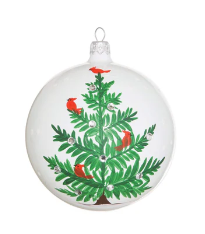 Mouthblown and handpainted in Italy, delight in the holiday magic as handpainted fir trees and bright cardinals settle on the fresh white canvas of the Lastra Holiday Tree Ornament. Add this traditional ornament to your tree or give as a gift during your annual Christmas party.