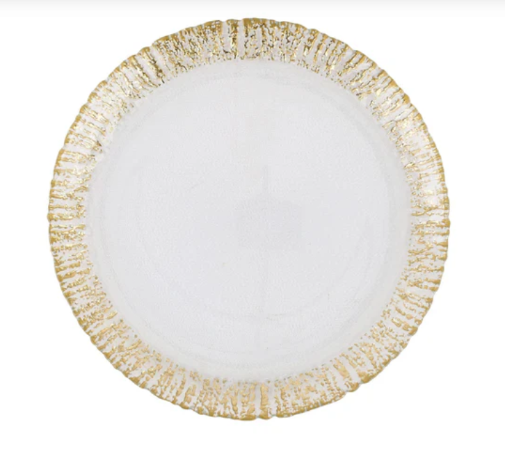 With glowing strands and beautiful texture, the Rufolo Glass Dinner Plate brings luster, glamour, and irresistibly Italian style to your table.