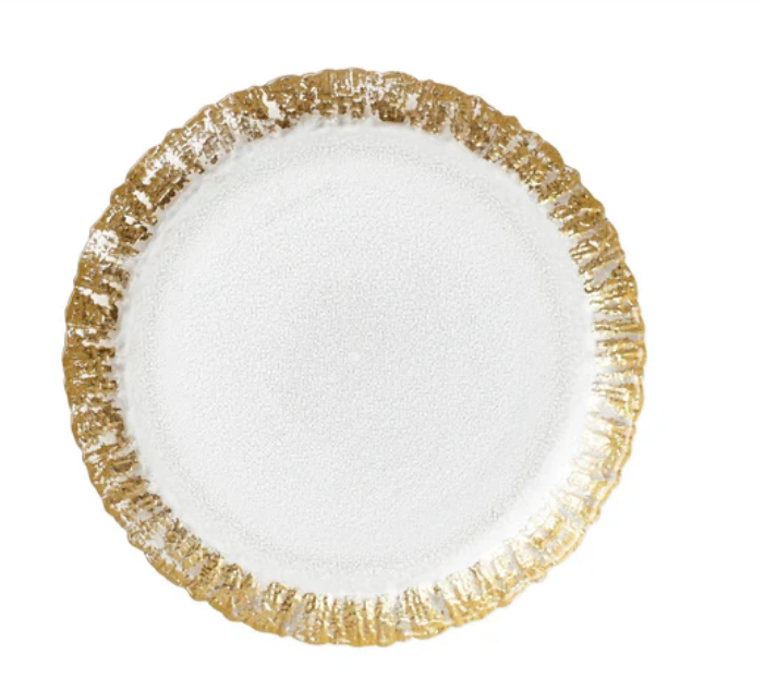 With glowing strands and beautiful texture, the Rufolo Glass Dinner Plate brings luster, glamour, and irresistibly Italian style to your table.
